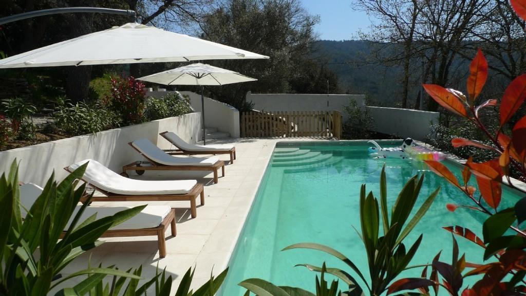 A luxurious fully modernized five bedroomed villa, close to the village of Collobrieres, set in an acre of wooded land with a garden around the house, a full size swimming pool and panoramic views.